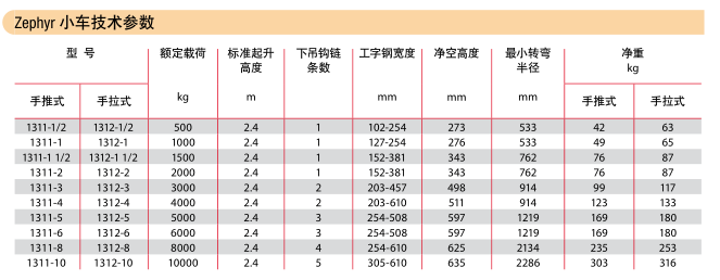 所有Zephyr型小車組合手拉環鏈葫蘆可應用于寬型工字鋼、軌道、標準工字鋼和特制或國際型號工字鋼。