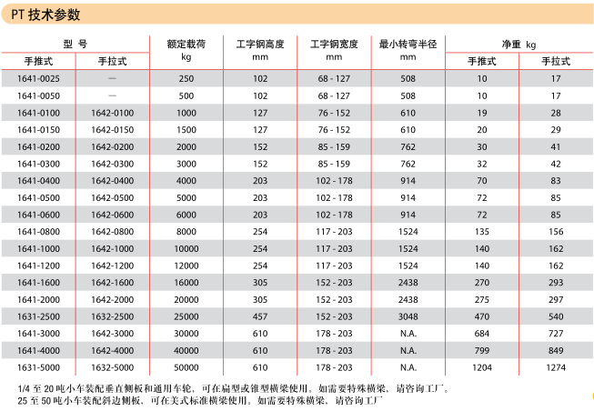 ·車輪一邊采用重型鋼制側(cè)板,具有更高強(qiáng)度及硬度,對車輪提供額外保護(hù)。0.25-12噸小車采用通用型胎面適用于平直或錐形橫梁。16-25噸小車適用于錐形美國標(biāo)準(zhǔn)橫梁。如有特殊橫梁需求,請咨詢工廠。