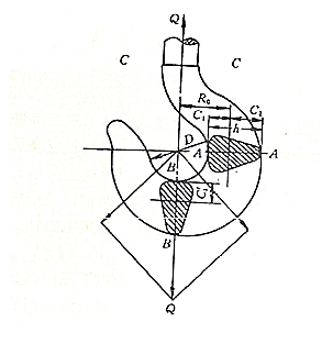 三、CC斷面 由于貨物Q的作用,在該面上這個作用力有把吊鉤拉斷的趨勢,這個斷面位于吊鉤柄柱螺紋的退刀槽處,該斷面為吊鉤最小斷面,有被拉斷的危險。