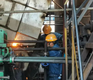 管道壁這么厚,又是特殊鋼材,檢修人員先用等離子槍整體切斷管道壁,但是因為位置受限無法整體吊裝,工人們便使用分段吊裝,拆卸法蘭、切割、吊裝,多點作業同時進行,風機主體轉子落地,拆除工作順利完成。